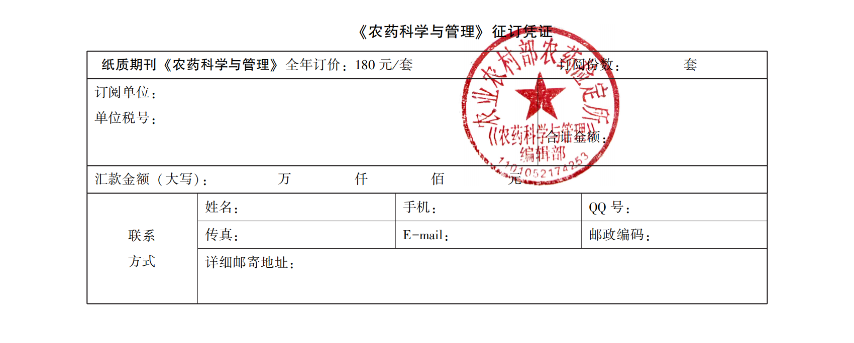 订阅指南:《农药科学与管理》月刊,大16开,每期纸质期刊国内定价为15元,全年12期,共计180元,订阅纸质期刊免费赠送电子期刊,可直接向本刊编辑部联系订阅或网上在线订阅(http://www.chinapesticide.org.cn/kgls/subscribe)。
