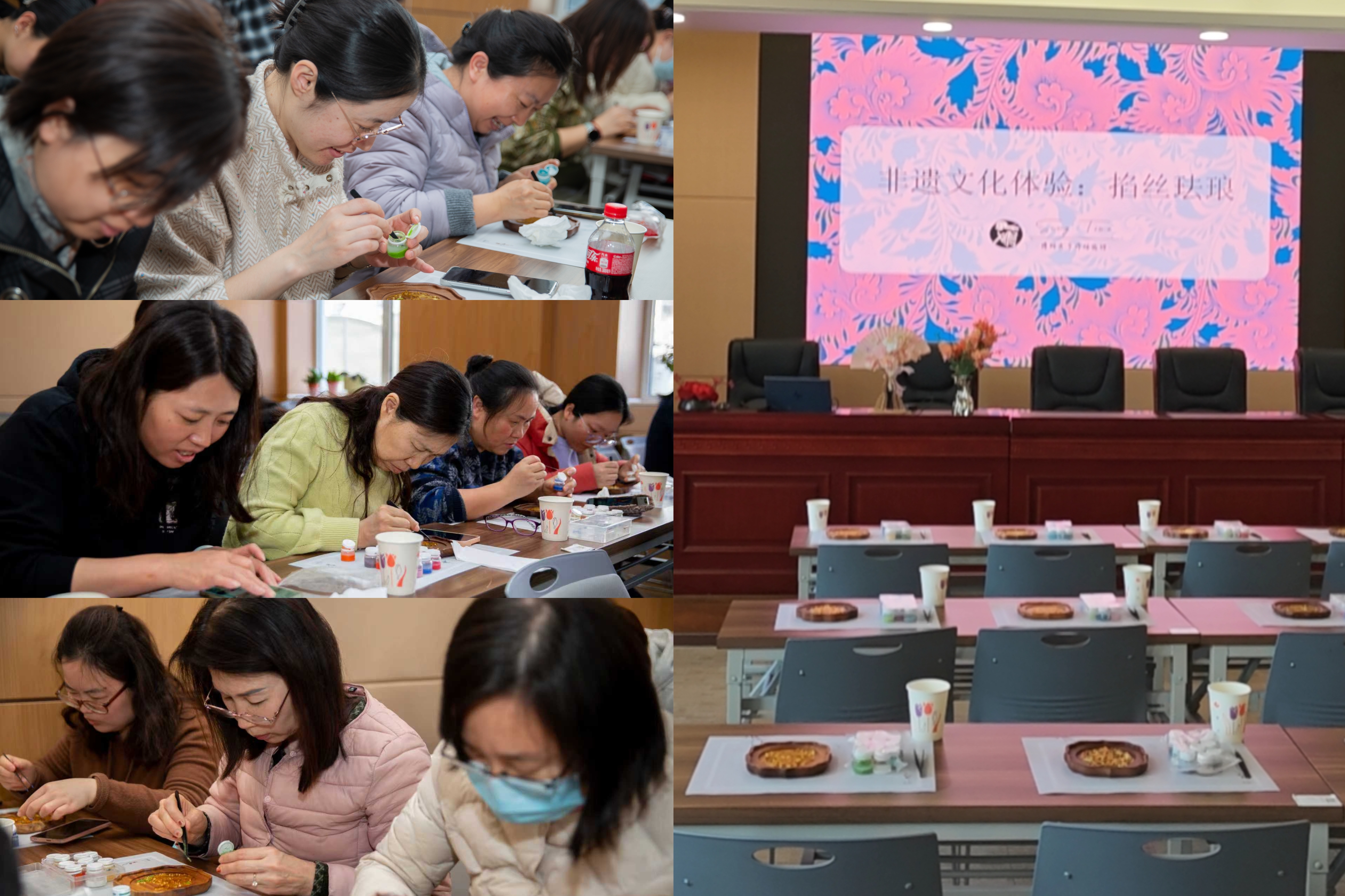 活动现场,授课老师为大家系统讲解了掐丝珐琅的发展历史、制作流程与工艺技巧,使大家对这一“燕京八绝”之一的传统技艺有了更加深入的了解。在动手体验环节,女同志们兴致盎然、认真投入,纷纷化身非遗匠人,手执镊子全神贯注地进行创作,将色彩缤纷的釉料层层点染于铜丝图案之中。大家在专注创作的过程中,沉浸式感受传统工艺的独特魅力,充分体验非遗手工艺术的独特韵味与文化内涵。